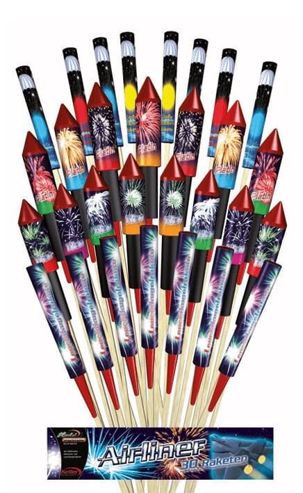 Maximal große Raketen-Kollektion mit Top-Effekten. Hervorragende Sternenbuketts sowie imposante Fallschirm- und Leuchtkugelraketen in den Farben Gelb, Grün, Rot, Blau und Violett. 30 Raketen
