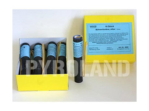 ca. 3m hohe , raucharme Silberfontäne von ca. 12 Sek. Brenndauer mit sehr hoher Funkendichte. 1 Packung á 10 Stück Elektrisch zündbar! Mit einer geeigneten Zündanlage nutzen. Technische Voraussetzungen: Mindestens 12V oder 0,85