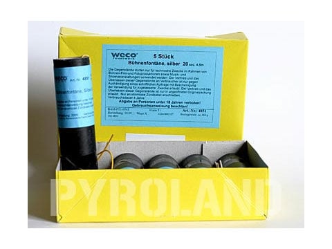 ca. 4,5m hohe , raucharme Silberfontäne von ca. 20 Sek. Brenndauer mit sehr hoher Funkendichte. 1 Packung á 5 Stück Elektrisch zündbar! Mit einer geeigneten Zündanlage nutzen. Technische Voraussetzungen: Mindestens 12V oder 0,85