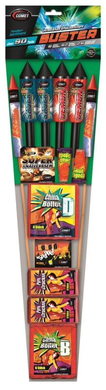 Comet Buster Familien-Sortiment 200-teilig – soundstarke und leuchtkräftige Freude für die ganze Familie Fragt man, welche Art von Feuerwerk Silvester gern gesehen ist, antworten die einen mit „Leuchtfeuerwerk“ und die anderen mit „Böller“. Du kannst Dich nicht entscheiden, für welche Variante Dein Herz lauter schlägt, oder möchtest Du den Ansprüchen Deiner gesamten Familie genüge tun? Das Familien-Sortiment Comet Buster ist 200-teilig und hat ein großes Spektrum an Effekten an Bord. Es bietet Freude für die ganze Familie und ist die optimale Wahl, um Silvester gemeinsam zu erleben. Traditionell ist es zu Silvester Brauch, mit einem Feuerwerk böse Geister zu vertreiben. Dank dem erstklassigen Mix aus 6 Silvesterraketen für leuchtenden Zauber am Nachthimmel, Super-Knallerbsen und lauten China-Böllern schöpfst Du beim Familien-Sortiment Comet Buster aus dem Vollen. Hohe Leuchtkraft im Familien-Sortiment Leuchtfeuerwerk lädt Dich und Deine Lieben ein, funkelnde Momente des Innehaltens im Kreise der gesamten Familie zu erleben. Die im Comet Buster Sortiment enthaltenen 6 Silvesterraketen bersten am Himmel mit atemberaubenden Effekten. 2 Mini-Vulkane lodern in aller Stille und erhellen die Umgebung mit ihrem magischen Schein – eine Aura, die im unmittelbaren Umfeld ein eindrucksvolles Ambiente kreiert. Das Feuerwerk hat aber auch einige akustische Effekte zu bieten. Wie sich das Familien-Sortiment um Mitternacht lautstark bemerkbar macht, liest Du jetzt. Feuerwerk mit vielseitigen Sound-Effekten Die China-Böller B und China-Böller D lassen es zusammen mit dem Pyro-Cracker von Comet Buster richtig krachen. Kobold Snapper lassen um Mitternacht die Puppen tanzen und helfen Dir, böse Geister zu vertreiben. Super-Knallerbsen kannst Du auf einem festen Untergrund lautstark zerplatzen lassen. Hat sich jetzt noch nicht der letzte böse Geist erschrocken, kommen Dir die Kobold Snapper abermals zu Hilfe. Das vielseitige Familien-Sortiment rund um 6 Silvesterraketen bereitet Freude für die ganze Familie. Entscheide Dich, Silvester gemeinsam zu erleben und das neue Jahr mit diesem Mega-Sortiment willkommen zu heißen!