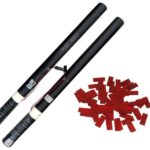 2 bunte Papierspiralen sinken sich drehend langsam zum Boden hinab.