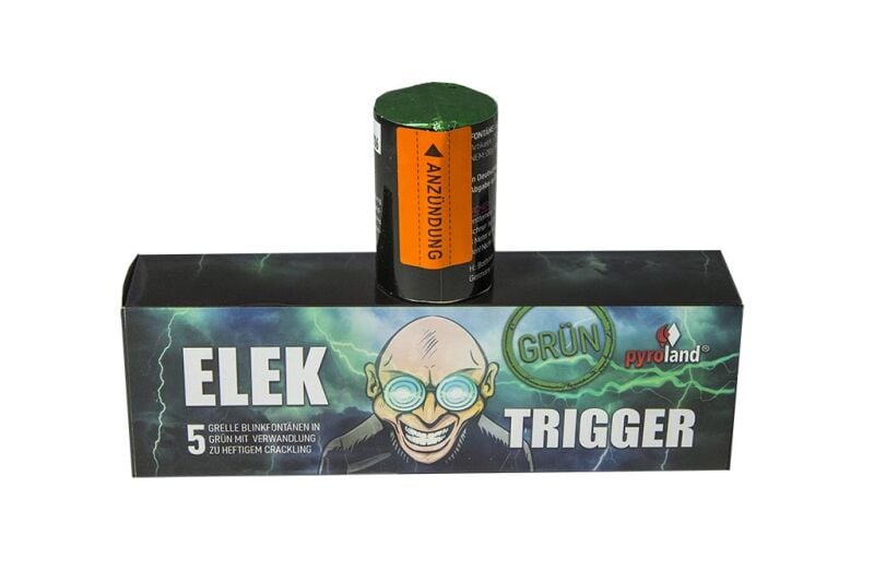 Heute kommt der ELEKTRIGGER zu Euch – und der triggert ganz schön! Grelle grüne Blinkerbengalos mit Verwandlung zu heftigem Crackling. 5 Stück pro Schachtel in echt handlicher Größe. Diese Dinger machen wirklich Spaß auf der Straße! Man sollte natürlich nicht direkt in den Blitz blicken, eher in die Umgebung, dann blitzen die umliegenden Häuser farbintensiv Grün.
