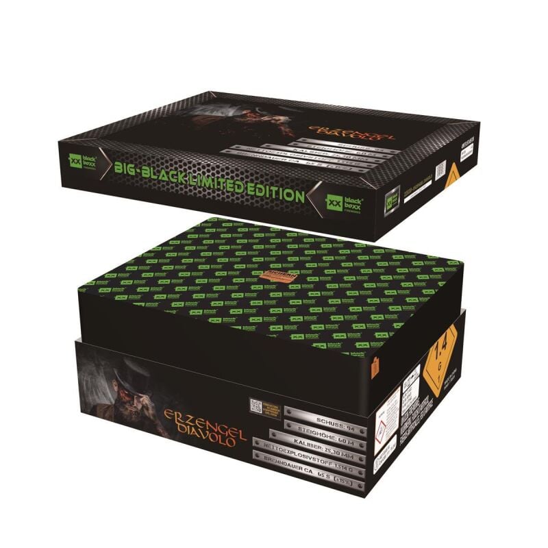 Ein Verbundfeuerwerk von Blackboxx’s Big-Black Limited Edition, bestehend aus 4 verschiedenen Batterien mit verschiedenen Effektkombinationen in folgender Performance: 1. V-Fächer aus Titangold-Schweifkometen mit Verwandlung zu Titangold-Palmen. 2. V-Fächer aus Titangold-Schweifkometen in silbernen Feuertöpfen und mit Verwandlung zu Titangold-Weiden mit Rotblinkern. 3. Z-Fächer aus Goldflimmerschweifkometen mit Verwandlung zu Goldflimmerkronen mit roten Dahlien-Sternen. 4. Z-Fächer aus Titangold-Feuertöpfen und blauen Kometen mit Verwandlung zu Titangold-Buketts mit blauen Sternen. 5. Fächer aus Silberblinker-Feuertöpfen und Titangold-Schweifkometen mit Verwandlung zu Titangold-Weiden mit blauen Sternen und Rotblinkern. 6. Fächer aus Titangold-Feuertöpfen und blauen Kometen mit Verwandlung zu Titangold-Buketts mit blauen Sternen.