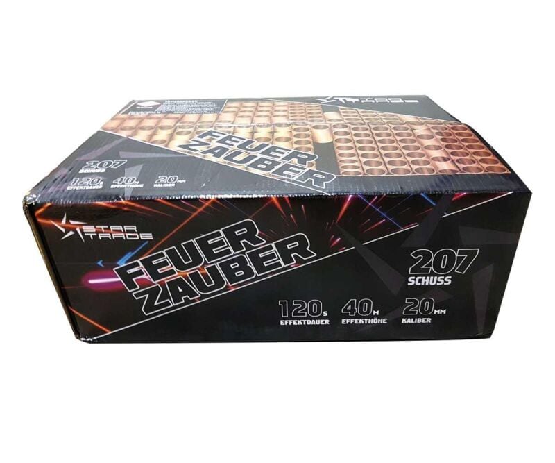 Feuerwerkverbund mit großem und imposantem Finale Das Jahr lässt sich kaum besser beenden als mit einer prächtigen Komposition Silvesterfeuerwerk. Die 207-Schuss in diesem hochwertigen Feuerwerkverbund sorgen für staunende Blicke und ein einmaliges Erlebnis. Der Startrade Feuerzauber erleichtert Dir die Konzeption Deiner Neujahrsfeier. Auf einen Schlag erhältst Du ein umfassendes Angebot aufeinander abgestimmter Feuerwerksentladungen. Mit nur einer Zündung schaffst Du ein lange währendes Spektakel. Gewaltige Effekte begeistern Deine Familie, Deine Gäste und Nachbarn. Ihr furioser Anblick erregt den traditionsreichen Zauber von Silvester und markiert mit fulminantem Farbenspiel den Abschluss des vergangenen und den hoffnungsvollen Beginn des neuen Jahres. Lass Dich verzaubern und erlebe die kunstvollen Farbkombinationen in diesem ganzheitlichen Silvesterfeuerwerk. Feuerzauber zum Silvesterfest Seit Anbeginn der Zeit haben Menschen das Jahresende feierlich begangen. Dabei spielten Feuer und Licht stets eine große Rolle. Diese lange Traditionslinie, die auf dem gesamten Erdball parallel zustande kam, setzt sich bis heute fort. Nachdem im mittelalterlichen China die ersten Feuerwerke entwickelt wurden, verbreitete sich der Brauch ihrer alljährlichen Darbietung auf der ganzen Welt. Die wuchtige Klangkulisse und ihr beeindruckender Anblick am Sternenhimmel bezaubern seither die Menschen und bringen sie in Einklang mit ihren Wünschen und Hoffnungen. Sie werden sich ihrer Ziele gewahr und reflektieren bedächtig die Erlebnisse des vergangenen Jahres. Ein Feuerwerk markiert den Neubeginn und den Startschuss für alle Freuden des nunmehr eingeläuteten Lebensabschnitts. Mit diesem Startrade-Feuerwerk kreierst du auf einen Schlag ein denkwürdiges Ereignis für die ganze Familie. Die 207-Schuss umfassende Batterie entfaltet auf dein Kommando eine Zeitreise durch hunderte Generationen Menschheitsgeschichte. Bring das Himmelszelt zum Leuchten und versammle Deine Liebsten unter diesem eindrucksvollen Anblick. Gewaltige Effekte auf 40 Meter Effekthöhe Dieser effektreiche Feuerwerksverbund trägt 207 bunte Ladungen. Nach der Zündung entfaltet sich die ganze Wirkung ohne weiteres Zutun. Die Brenndauer beträgt stolze zwei Minuten. Innerhalb dieser Zeit schießt der Verbund in variierendem Rhythmus sowie mit großem und imposantem Finale einzelne Schübe auf 40 Meter Effekthöhe. Dort detonieren die schönen Ladungen zu einem roten, grünen oder goldenen Funkengewitter, das glitzernd zu allen Seiten ausfächert. Die einzelnen Schüsse entsprechen dem 20mm Kaliber und der Kategorie F2. Das Gewicht dieser Verbundladung beträgt insgesamt 13,48 Kilogramm. Die schiere Fülle der aufeinanderfolgenden Knall- und Glanzeffekte sorgt für ein einmaliges Erlebnis und eignet sich auch für die Verwendung in größeren Feuerwerkskompositionen. Mit dem hochwertigen Feuerwerkverbund Feuerzauber von Startrade wird jede Silvesterfeier zum Erfolg.