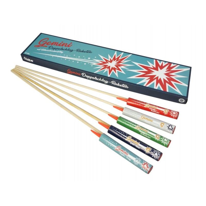 Sortiment aus 5 verschiedenen Doppelschlag-Raketen mit Silberschweifaufstieg. Enthalten sind: 1.) Gemini Gold + Blau: Silberschweifaufstieg zu 2 Buketts: 1.) Goldregen 2.) blaues Sternbukett 2.) Gemini Duplex-Cracker: Silberschweifaufstieg zu 2 Buketts: 1.) Goldcracker 2.) Silbercracker 3.) Gemini Brokat + Grünblinker: Silberschweifaufstieg zu 2 Buketts: 1.) Brokatweide 2.) grünes Blinkbukett 4.) Gemini Corolla + Rotblinker: Silberschweifaufstieg zu 2 Buketts: 1.) Corollaweide 2.) rotes Blinkbukett 5.) Gemini Duplex-Polyp: Silberschweifaufstieg zu 2 Buketts: 1.) Polyp blau 2.) Polyp Rot
