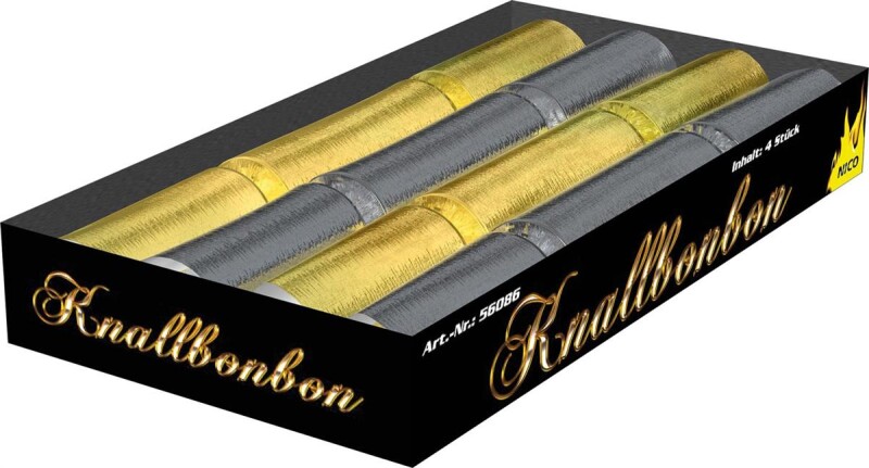 4 Knallbonbons, 18 cm lang, in bedruckter Schachtel