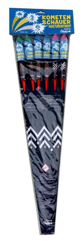 Sortiment aus 3 verschiedenen Raketen mit gemischten Effekten, je 2 Raketen pro Sorte, immer mit speziellem Schweifaufstieg und immer mit der maximal in deutschland zulässigen Satzmenge von 20g pro Rakete. Folgende Raketen sind enthalten: 2x Draco-Rakete Effekt: Silbercracker-Schweifaufstieg zu Silbercracker-Bukett mit roten Dahliensternen 2x Aquarius-Rakete Effekt: Silberblinker-Schweifaufstieg zu silberner Blinkweide mit blauem Sternbukett 2x Taurus-Rakete Effekt: Grünblinker-Schweifaufstieg zu violetter Dahlie mit grünem Blinksternbukett