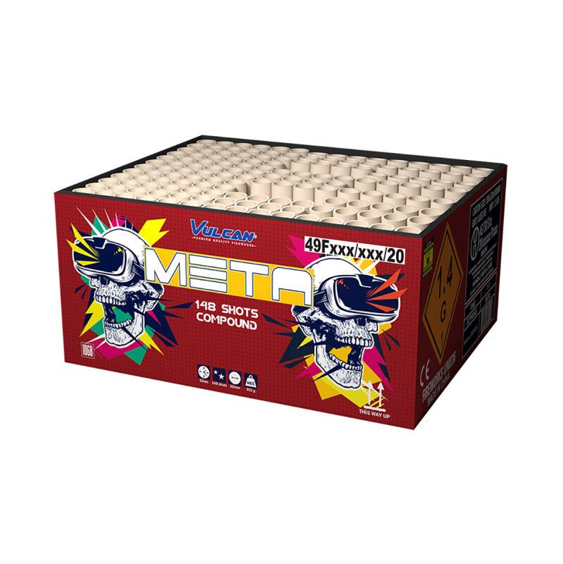 Das neueste und beeindruckendste Verbundfeuerwerk auf dem Markt! Mit 148 Aufnahmen, darunter 80 fächerförmigen Aufnahmen, ist Meta eine komplette Show in einer Box, die jeden, der sie sieht, in Erstaunen versetzen wird. Zünden Sie einfach die Zündschnur an und treten Sie zurück, um ein unglaubliches Farb- und Klangspektakel zu genießen. Dieses professionelle Feuerwerk ist perfekt für jeden, der Ihre Nachbarschaft beneiden möchte!
