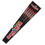 69 Schuss nacheinander, in Gerade und Fächer aufsteigenden mit einem breiten Spektrum an Effekten. Kombinationen aus intensiven Sternen und bunten Sternen zaubern mächtige Buketts in den Himmel.