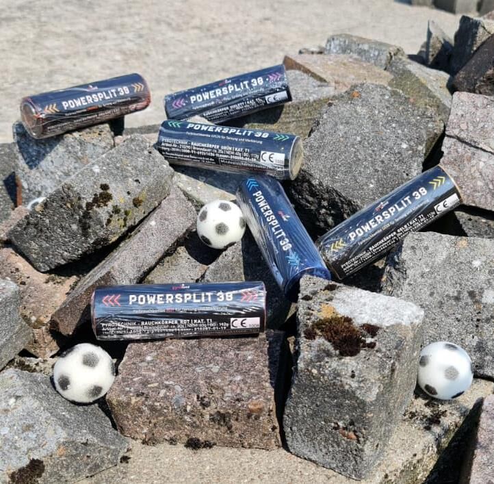 1x POWERSPLIT 38 mit Reißzünder 20s, Rot 1x POWERSPLIT 38 mit Reißzünder 20s, Blau 1x POWERSPLIT 38 mit Reißzünder 20s, Gelb 1x POWERSPLIT 38 mit Reißzünder 20s, Grün 1x POWERSPLIT 38 mit Reißzünder 20s, Orange 1x POWERSPLIT 38 mit Reißzünder 20s, Violett
