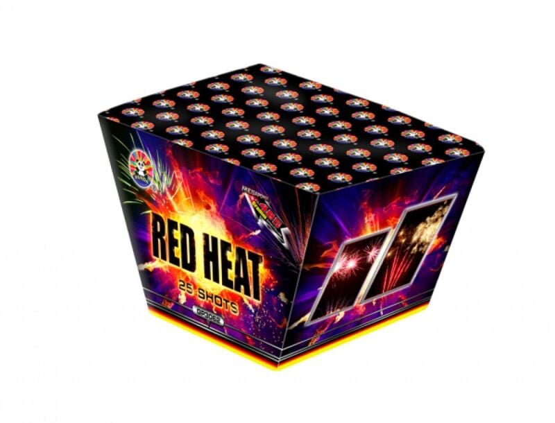25-Schuss Megapower Fächerbatterie 1.-20. Schuss blau/goldene Crackling Feuertöpfe zu roten Sternenbuketts mit weißen Blinksternen 21.-25. Schuss blau/goldene Crackling Feuertöpfe zu roten Sternenbuketts mit Cracklingbuketts, immer mit dumpfen Knall.