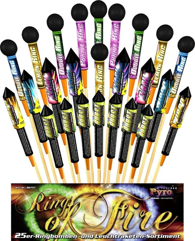 25teiliges Raketensortiment. Gewinne die Macht über das Feuer und zaubere mit Donnerhall Feuerkreise an den Himmel! 25 Turbo-, Ring- und Flash-Raketen inszenieren ein nie erlebtes Feuerspektakel. Inhalt: 3x Lemon Ring, 2x Purple Ring, 3x Doppel-Ring green & violett, 2x Doppel-Ring blue & lemon, 7x Burst, 2x Turbo blau, 2x Turbo gelb, 2x Flash rot, 2x Flash blau, 1x Anzündstäbchen