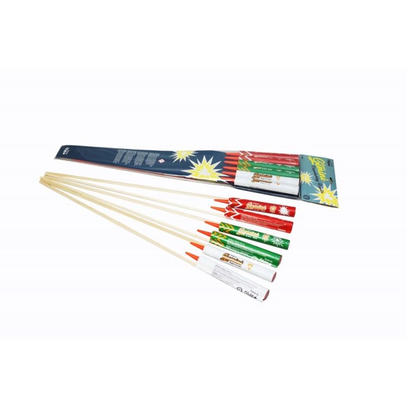 Sortiment aus 3 verschiedenen Doppelschlag-Raketen mit neuartigen Aufstiegseffekten. Effekte: 1.) Super-Gemini Duplex-Cracker: Silber-Cracklingschweif zu 2 Buketts: 1.) Goldcracker 2.) Silbercracker 2.) Super-Gemini Brokat-Blink: Grüner Blinkschweifaufstieg zu 2 Buketts: 1.) Brokatkrone 2.) grünes Blinkbukett 3.) Super-Gemini Corolla-Blink: Corolla Schweifaufstieg zu 2 Buketts: 1.) Corollaweide 2.) rotes Blinksternbukett