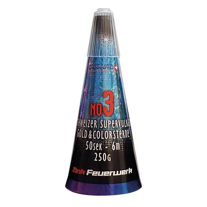 Schweizer Supervulkan Gold & Colorsterne,   Vulkan mit platzenden Goldfunken, der nach ca. der Hälfte der Brennzeit zusätzlich color  Sterne mit auswirft. Das besondere an diesem Vulkan ist auch die sehr helle Blinkphase zu Beginn.