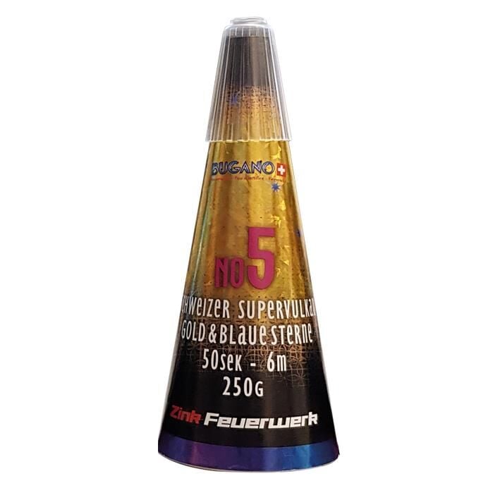 Schweizer Supervulkan Gold mit blauen Sternen (Azzurro). Vulkan mit platzenden Goldfunken, der nach ca. der Hälfte der Brennzeit zusätzlich blaue Sterne mit auswirft. Der Vulkan startet mit einer rotfarbenen Bengal-Basis. Made in Germany!